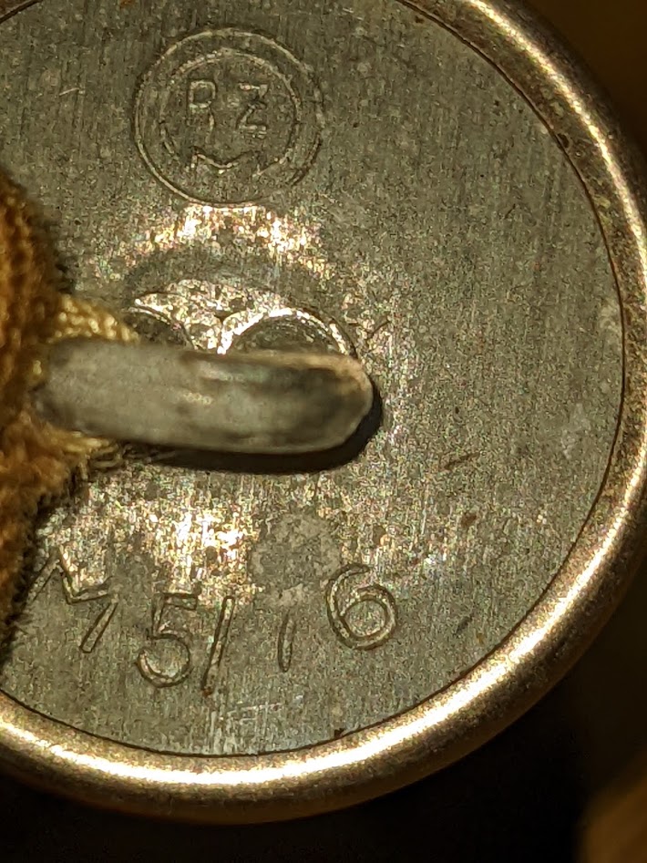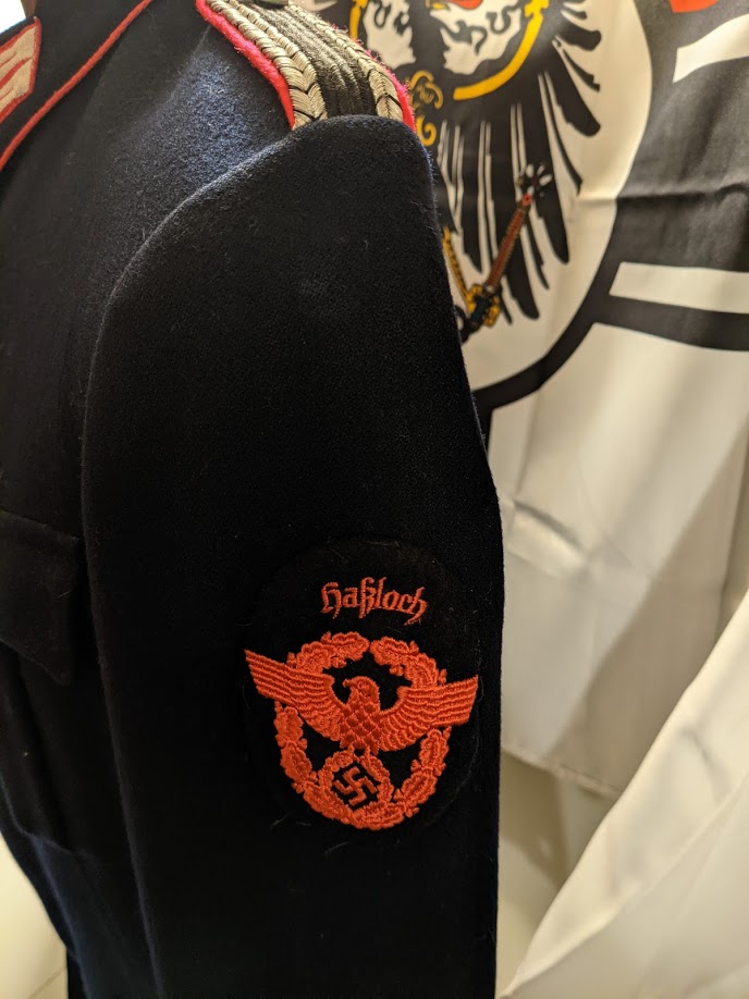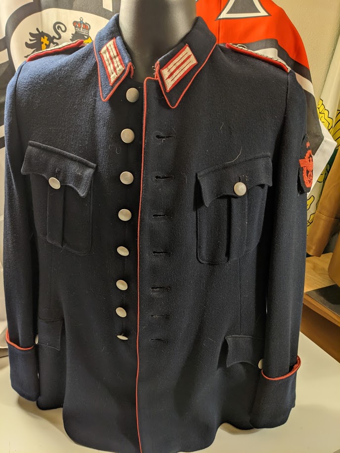 Feuerschutzpolizei Tunic – #FSP001 -Nice quality, deep navy blue doeskin wool construction service tunic features a vertical, eight button front closure with dual metal hooks and eyes positioned at the forward neckline and a lay down collar. The upper left sleeve has a machine embroidered, wreathed, police style national eagle with out-stretched wings, clutching a wreathed, canted, swastika in it’s talons, situated beneath the Gothic scripted, duty location, “Hakloch”, all in carmine truppenfarben rayon threads mounted on a cut-out, vertically oval, navy blue wool base. The police eagle base is very lighty hand stiched to the sleeve (still attached but slightly loose). The interior of the tunic is fully lined in ribbed, black, cotton/rayon blend material with grey striped, white rayon sleeves. The buttons are all the bright silver washed, magnetic sheet metal, type and all but the smooth finished, belt ramp support buttons, have a pebbled finish. Buttons all look to be original stitching. The tunic is roughly size 34″ chest.