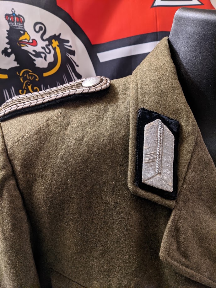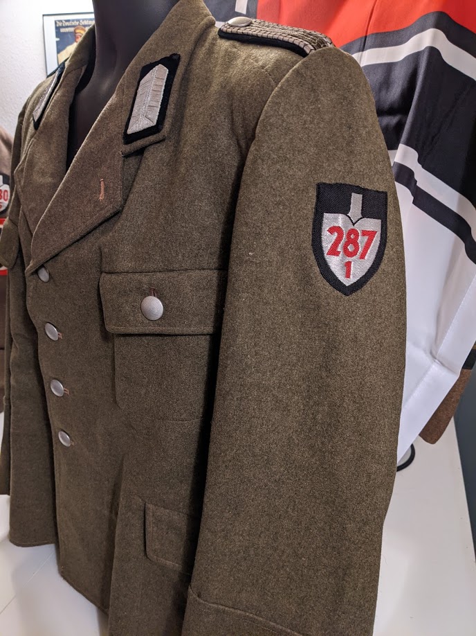RAD Tunic – #RAD001 -Unterfeldmeister RAD Tunic – Abteilung 1/287. Tunic is in exceptionally nice condition. It is brown elastique wool, four pocket tunic. There appears to be a ‘repair’ to the right side shoulder area. Silver bullion on black velvet collar patches.