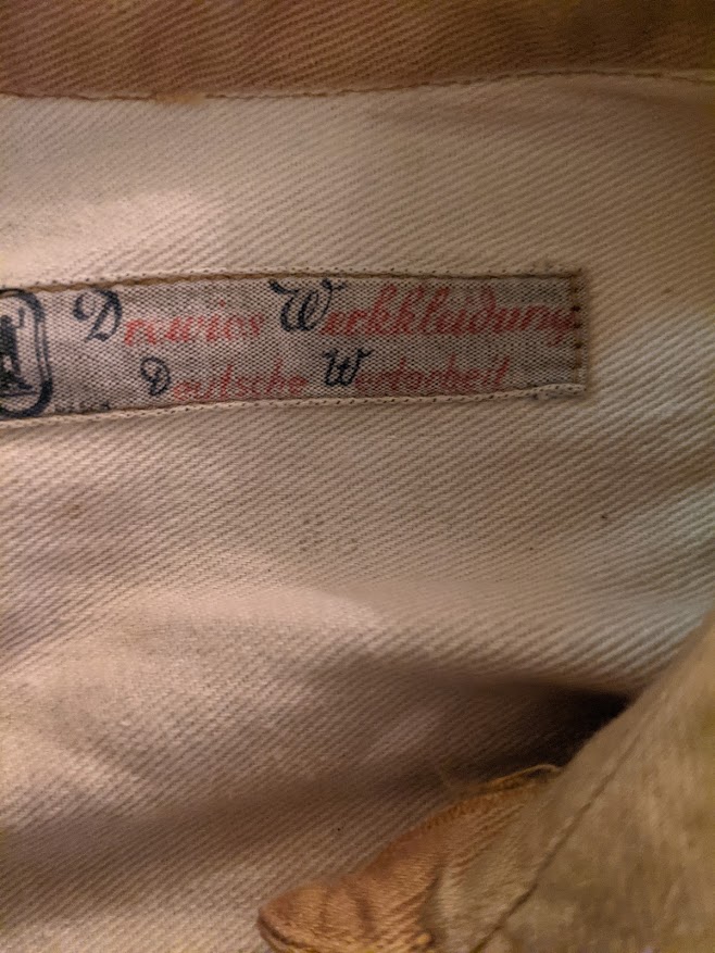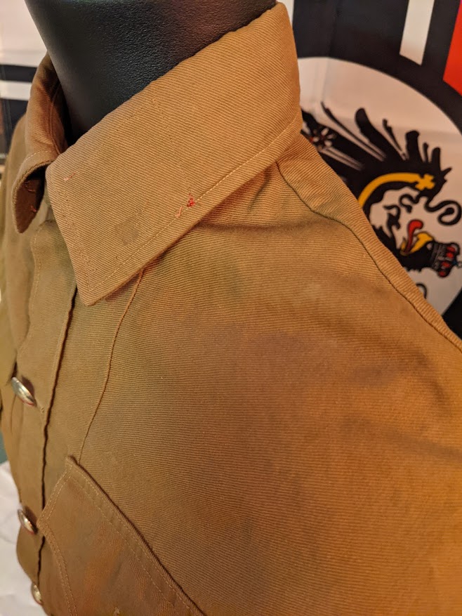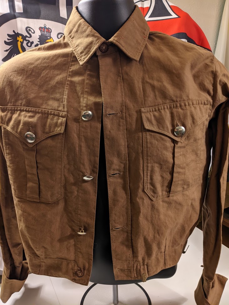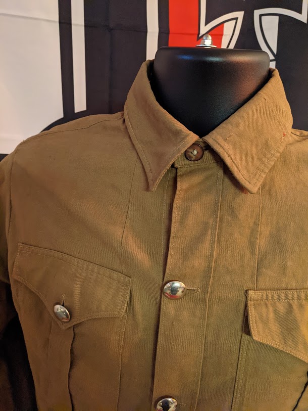 SOLD—Sturmabteilung Shirt – Cotton cloth, two breast pockets with creases, smooth silver buttons (one sleeve button inscribed “RZM M5 / 76” on the reverse). Signs of wear and age.