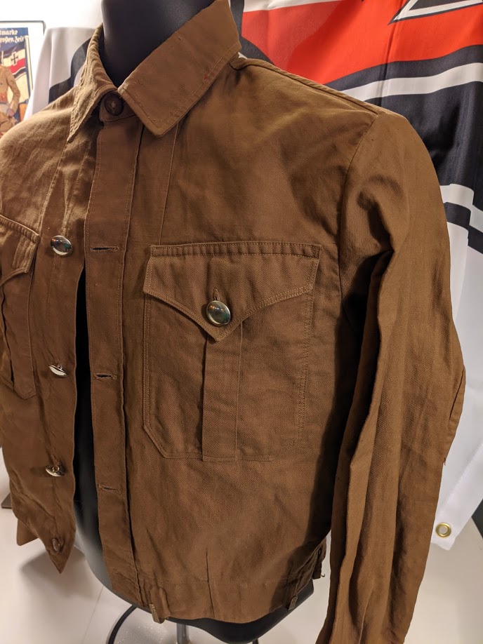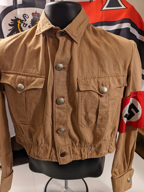 SOLD—-NSDAP Brown Shirt – – The service shirt is fabricated from greenish-brown cotton. There are two pockets on the front, one on each breast, each designed with a decorative pleat, each pocket with a gold metal button completed with a fold over flap with reinforced button hole. All nine of the gold metal buttons on the shirt illustrate a spread-winged eagle clenching a wreathed swastika in its talons and a pebbled background. There is a brown plastic button sewn in place at the neckline above the three silvered magnetic buttons and a reinforced button hole added below the last of the these buttons at the waist. There is an NSDAP armband pinned in place on the left sleeve, the armband with a white cotton circular patch bearing a black screen-printed swastika sewn in place on a red cotton field, the red cotton field.